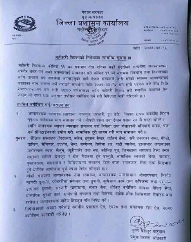 कोरोना संक्रमणको रोकथाम तथा नियन्त्रणका लागि स्थानीय प्रशासन ऐन, २०२८ को दफा ६(३) बमोजिम जिल्लाभर निषेधाज्ञा लगाइएको प्रमुख जिल्ला अधिकारी कटुवालले बताए। यस निषेधाज्ञाको अवधिमा अत्यावश्यक पसलहरु विहान ५ बजे देखि ११ बजेसम्म खोल्न पाइने जनाइएको छ।