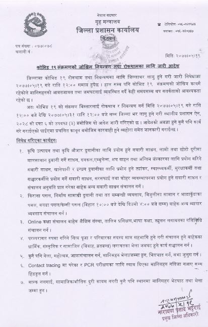 प्रमुख जिल्ला अधिकारी नारायणप्रसाद भट्टराईले शुक्रबार एक सूचना प्रकाशित गरी तोकिएका सेवाबाहेक सञ्चालन नगर्न आग्रह गरेका छन् । सूचनामा अत्यावश्यकीय वस्तुका अतिरिक्त निर्माण सामग्री, बिजुली, भाँडाकुँडा र कपडा पसललाई समेत सञ्चालन गर्न दिइने उल्लेख छ । ती पसलहरु बिहान १० देखि साँझ ४ बजेसम्म मात्रै सञ्चालन गर्न पाइने सूचनामा उल्लेख छ ।