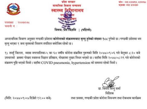 उहाँमा उच्च रक्तचापको समस्या समेत रहेको थियो । यो संगै गण्डकी प्रदेशमा कोरोना संक्रमणबाट एक सय ८८ जनाको मृत्यु भएको छ ।