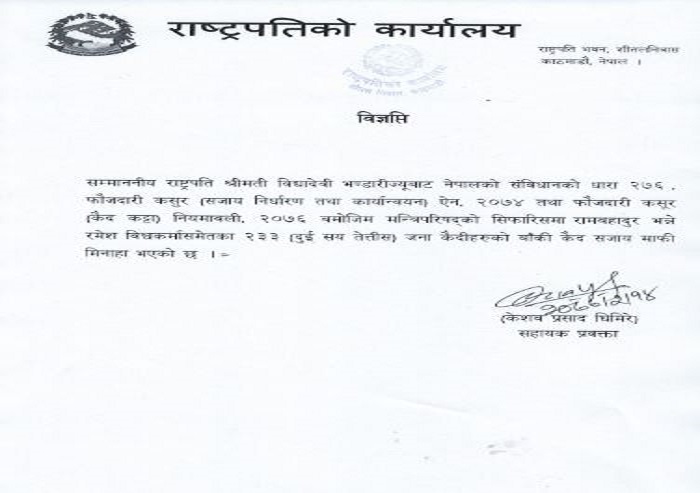 सरकारको सिफारिसमा राष्ट्रपति विद्यादेवी भण्डारीले कैद सजायँ मिनाहा र दण्ड जरिवाना माफी दिएकी हुन् । राष्ट्रपति कार्यालय शितल निवासबाट जारी विज्ञप्तिअनुसार रामबहादुर भन्ने रमेश विश्वकर्मा समेतका २३३ जना कैदीहरुको बाँकी कैद सजायँ माफी मिनाहा भएको छ ।