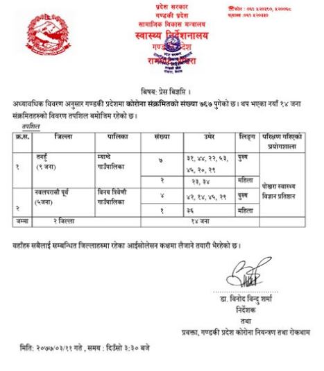 गण्डकी प्रदेशमा थप १४ जनामा कोरोना संक्रमण पुष्टि भएको छ ।