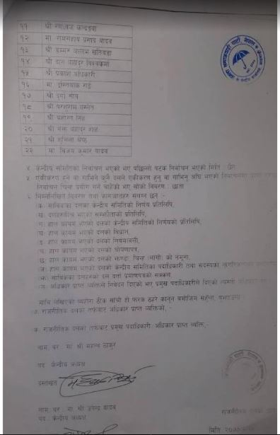 प्रस्तावित नयाँ पार्टीका पदाधिकारी र सदस्यहरुको नामावली सूचीमा अध्यक्ष महन्थ ठाकुर र उपेन्द्र यादव रहनु भएको छ । वरिष्ठ नेतामा तीन जना क्रमशः आशोक राई, डा. बाबुराम भट्टराई र राजेन्द्र महत्वको नाम रहेको छ ।