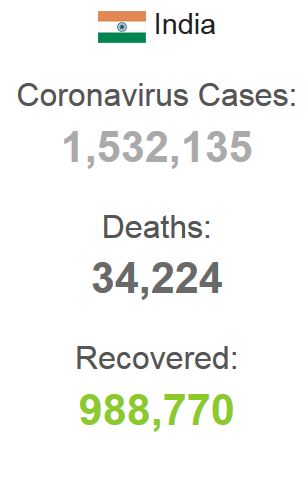 यो सँगै भारतमा कुल संक्रमित संख्या १५ लाख ३२ हजार १३५ पुगेको छ । यो संख्या विश्वकै तेस्रो धेरै तथा एसियामा सबैभन्दा बढी हो ।
