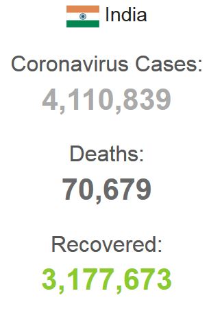 भारतमा कुल संक्रमितको संख्या ४१ लाख १० हजार ८३९ पुगेको छ। कोरोनाका कारण हिजो १ हजार भन्दा मानिसको मृत्यु भएसँगै कुल मृतकको संख्या ७० हजार ६ सय नाघेको छ।