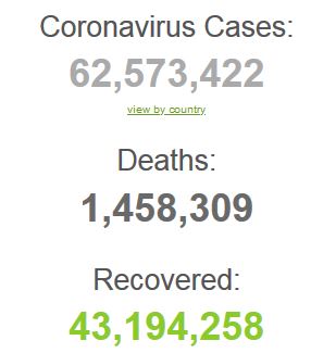 विश्वभर ६ करोड २५ लाखभन्दा बढी व्यक्तिमा संक्रमण पुष्टि भएको छ ।