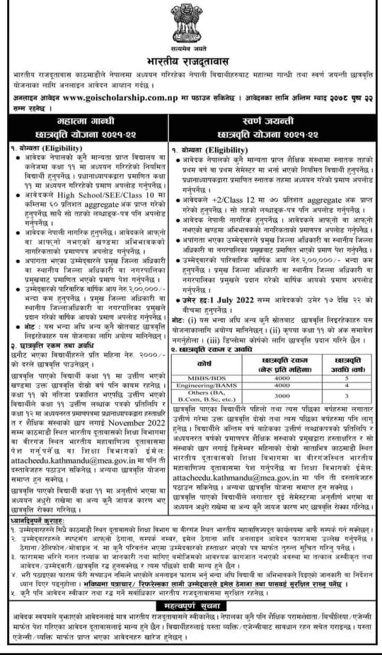 महात्मा गान्धी र स्वर्ण जयन्ती छात्रवृत्ति योजना २०२१-२२ को लागि अनलाइन आवेदनको लागि सूचना निकालेका छन्। भारतीय राजदुताबास काठमाडौँले नेपालमा अध्यन गरिरहेका नेपाली बिद्दार्थीहरुका लागि महात्मा गान्धी तथा स्वर्ण जयन्ति छात्र वृत्ति योजनाको लागि अनलाईन आवेदन आव्हान गरेका छन्।