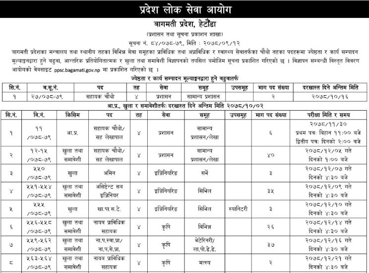 प्रदेश लोक सेवा आयोग बागमती प्रदेश हेटौडा स्थानीय सरकारी सेवा अनतर्गत स्थानीय तहका विभिन्न सेवा समुहका अप्राविधिक तथा प्राविधिक र स्वास्थ्य सेवा तर्फका विभिन्न पदको लागि ३९७ जना कर्मचारीको बिज्ञापन निकालिएको छ।
