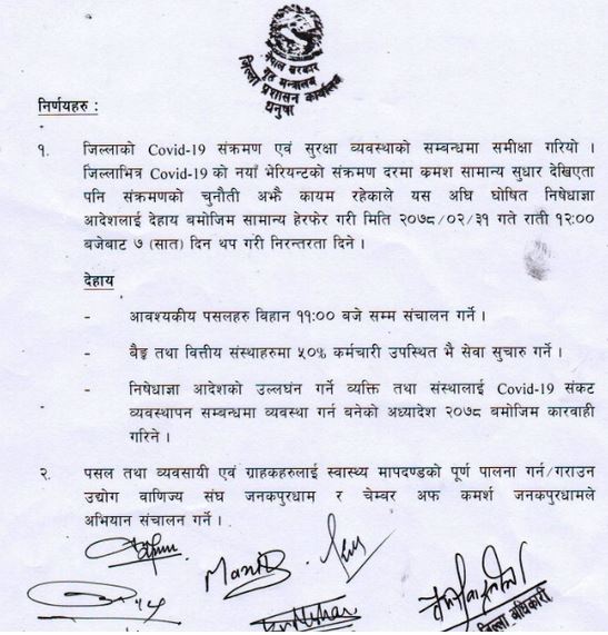 धनुषामा थप एक साता निषेधाज्ञा थप्ने निर्णय भएको छ ।