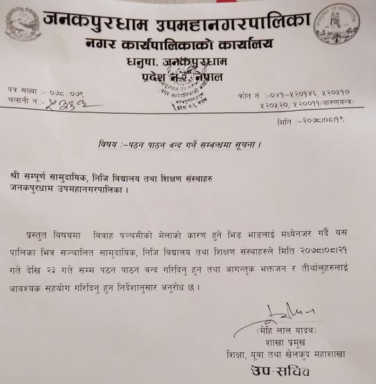 आज शाखा प्रमुख एक सूचना जारी गर्दै विवाहपञ्चमीको मेलाका कारण हुने भडिभाडलाई मध्यनजर गर्दै पालिका भित्र रहेको सामुदायिक, निजि विद्यालय तथा शिक्षण संस्थाहरुलाई मंसिर २१ गते देखि २३ गतेसम्म बन्द गर्ने निर्णय भएको जनाएका छन् ।