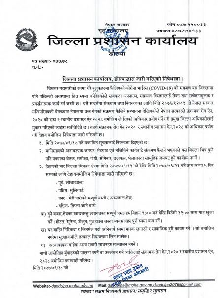 कोरोना भाइरस (कोभिड–१९) संक्रमण रोकथाम गर्न र फैलन नदिन डोल्पामा पाँच दिन लकडाउनको घोषणा गरिएको छ।