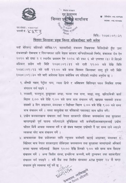 चितवनमा पुनः जेठ १३ गतेसम्म निषेधाज्ञाको समय लम्ब्याएको छ ।
