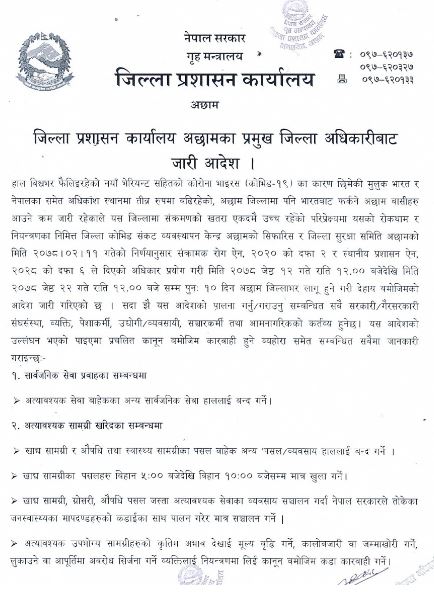 मंगलबार जिल्ला प्रशासन कार्यालय अछाममा बसेको जिल्ला कोभिड संकट व्यवस्थापन केन्द्रको बैठकले जिल्लामा थप १० दिन निषेधाज्ञा लम्ब्याउने निर्णय गरको हो।