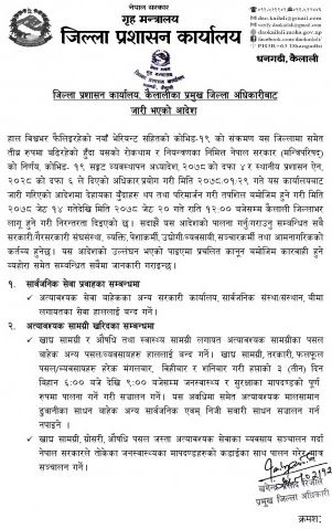 कैलाली जिल्लामा थप १ साता निषेधाज्ञा लम्ब्याइएको छ।