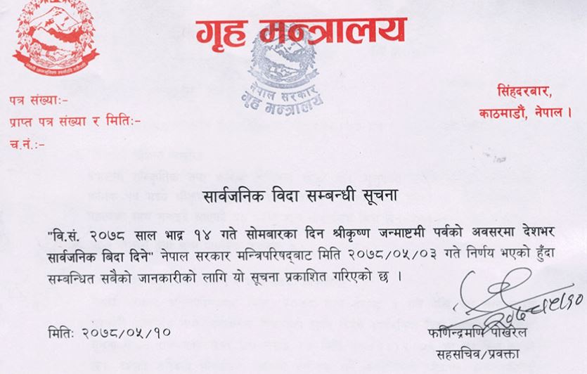 श्रीकृष्ण जन्माष्टमी परेकाले आउँदो सोमबार सार्वजनिक बिदा दिने निर्णय भएको गृहमन्त्रालयले जनाएको छ ।