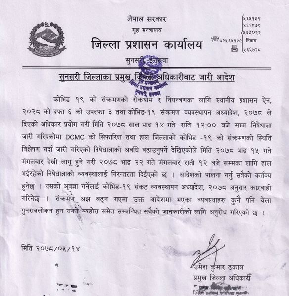 जिल्ला प्रशासन कार्यालय सुनसरीले पछिल्लो पटक थप गरेको निषेधाज्ञाको अवधि सोमबार रातिसम्म मात्रै रहेकाले थप एक साता निषेधाज्ञा थप गरिएको हो ।