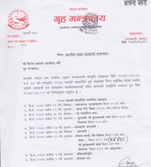 यस वर्षको वडादसैंका साइतहरू गृहमन्त्रालय द्धारा सार्वजनिक