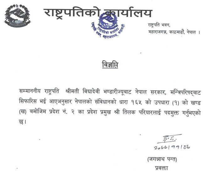 मन्त्रिपरिषद्को सिफारिसअनुसार राष्ट्रपति विद्यादेवी भण्डारीले नेपालको संविधानको धारा १६५ को उपधारा (१) को खण्ड (ख) बमोजिम प्रदेश प्रमुख परियालाई पदमुक्त गरेको राष्ट्रपति कार्यालयका प्रवक्ता जगन्नाथ पन्तले जानकारी दिएका छन् ।