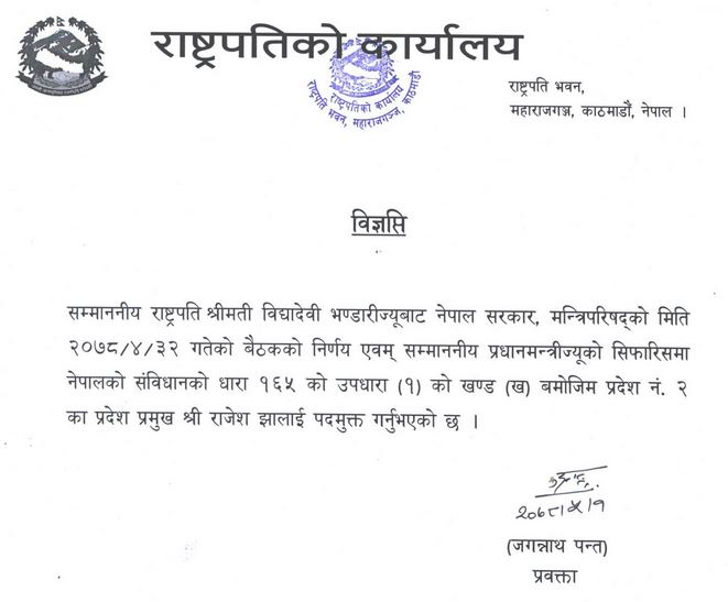 राष्ट्रपति विद्यादेवी भण्डारीले प्रदेश नम्बर २ का प्रमुख राजेश झा (अहिराज) लाई पदमुक्त गरेकी छिन् ।