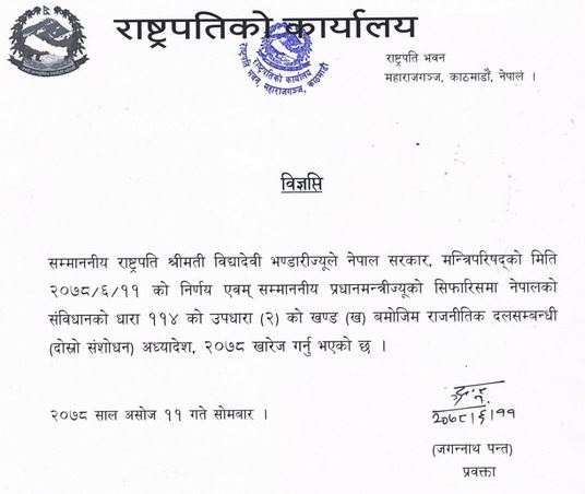 राष्ट्रपति कार्यालयद्वारा जारी विज्ञप्तिमा भनिएको छ, ‘ मन्त्रिपरिषद्को मिति २०७८/६/११ को निर्णय एवम् सम्माननीय प्रधानमन्त्रीज्यूको सिफारिसमा नेपालको संविधानको धारा ११४ को उपधारा (२) को खण्ड (ख) बमोजिम राजनीतिक दलसम्बन्धी (दोस्रो संशोधन) अध्यादेश, २०७८ खारेज गर्नु भएको छ ।’