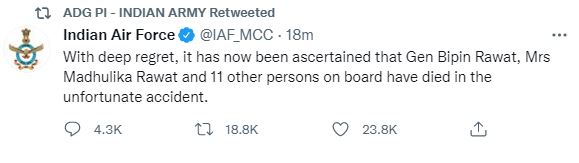 भारतमा उच्च आर्मी अधिकारी बिपिन रावत चढेको हेलिकप्टर दुर्घटनामा परि पुष्टी निधन पुष्टी भएको छ ।