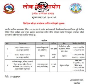 सम्माननत सर्वोच्च अदालतबाट मिति २०७८/१०/२६ को आदेश कार्यान्वयन गर्ने सिलसिला मा शाखा अधिकृत वा सो सरह प्राविधिक, नायक सुब्बा वा सो सरह अप्राविधिक विभिन्न सरह सरह सातौं र आठौ सरह को परिक्षा कार्यक्रम अर्को सूचना प्रकाशन नभएसम्मको लागि स्थगित गरिएको ।
