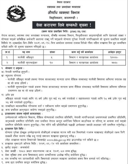औषधि व्यवस्था विभागले करार सेवामा कर्मचारी भर्ना गर्ने भएको छ ।