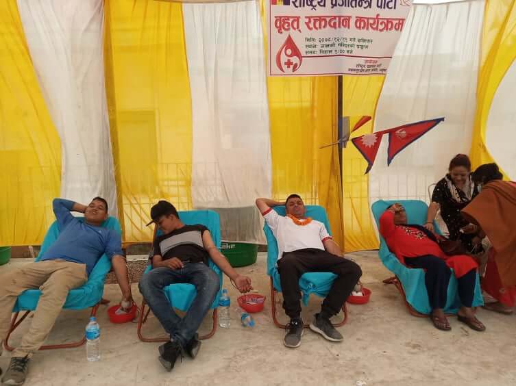 जनकपुरधामको जानकी मन्दिर प्रांगणमा आज रक्तदान कार्यक्रम सम्पन्न भएको छ । राष्ट्रिय प्रजातन्त्र पार्टीले आयोजना गरेको “रक्तदान जिवनदान” भन्ने मूल नाराका साथ नेपाल रेडक्रसको सोसाईटी जनकपुरधामको सहयोगमा बृहत रक्तदान कार्यक्रम सम्पन्न भएको हो ।