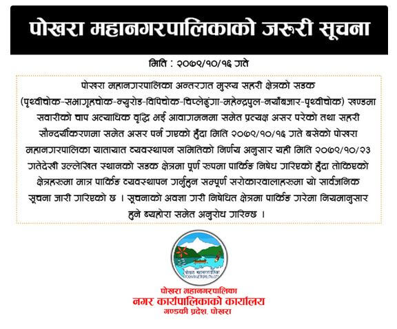 पोखराको पृथ्वीचोक, सभागृहचोक, न्युरोड, बीपीचोक, चिप्लेढुंगा, महेन्द्रपुल, नयाँबजारका सडकमा पार्किङ गर्न नपाइने महानगरपालिकाले जनाएको छ ।